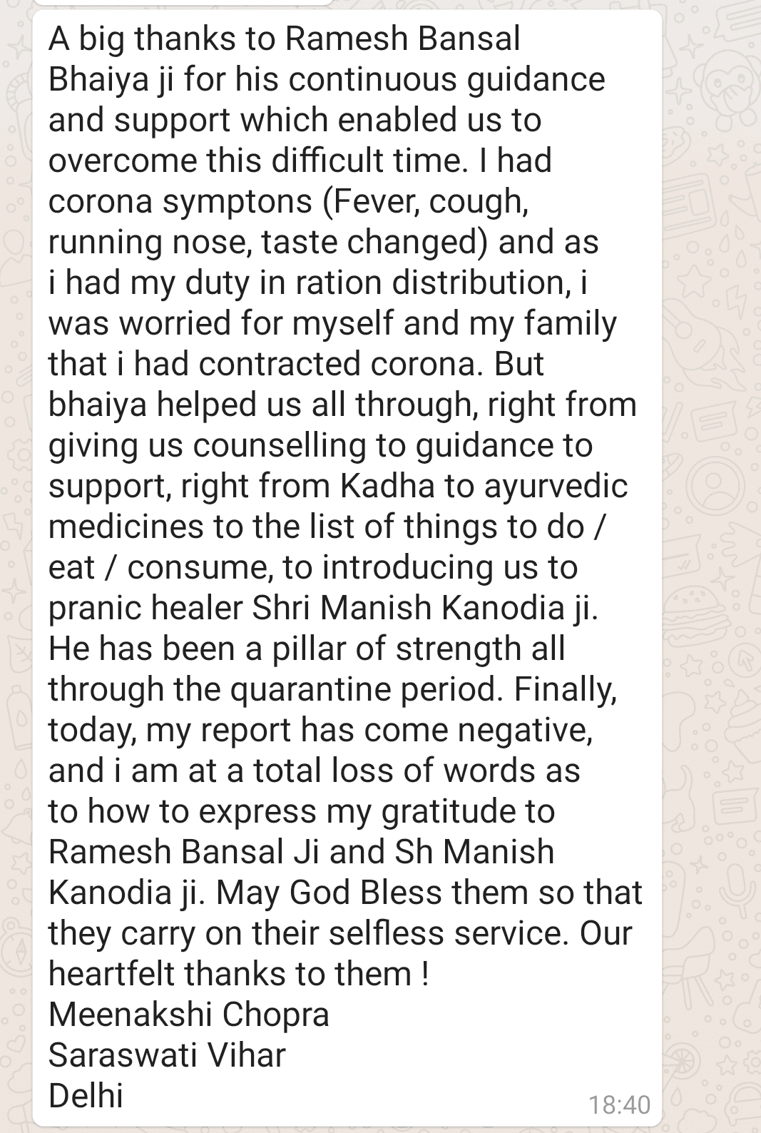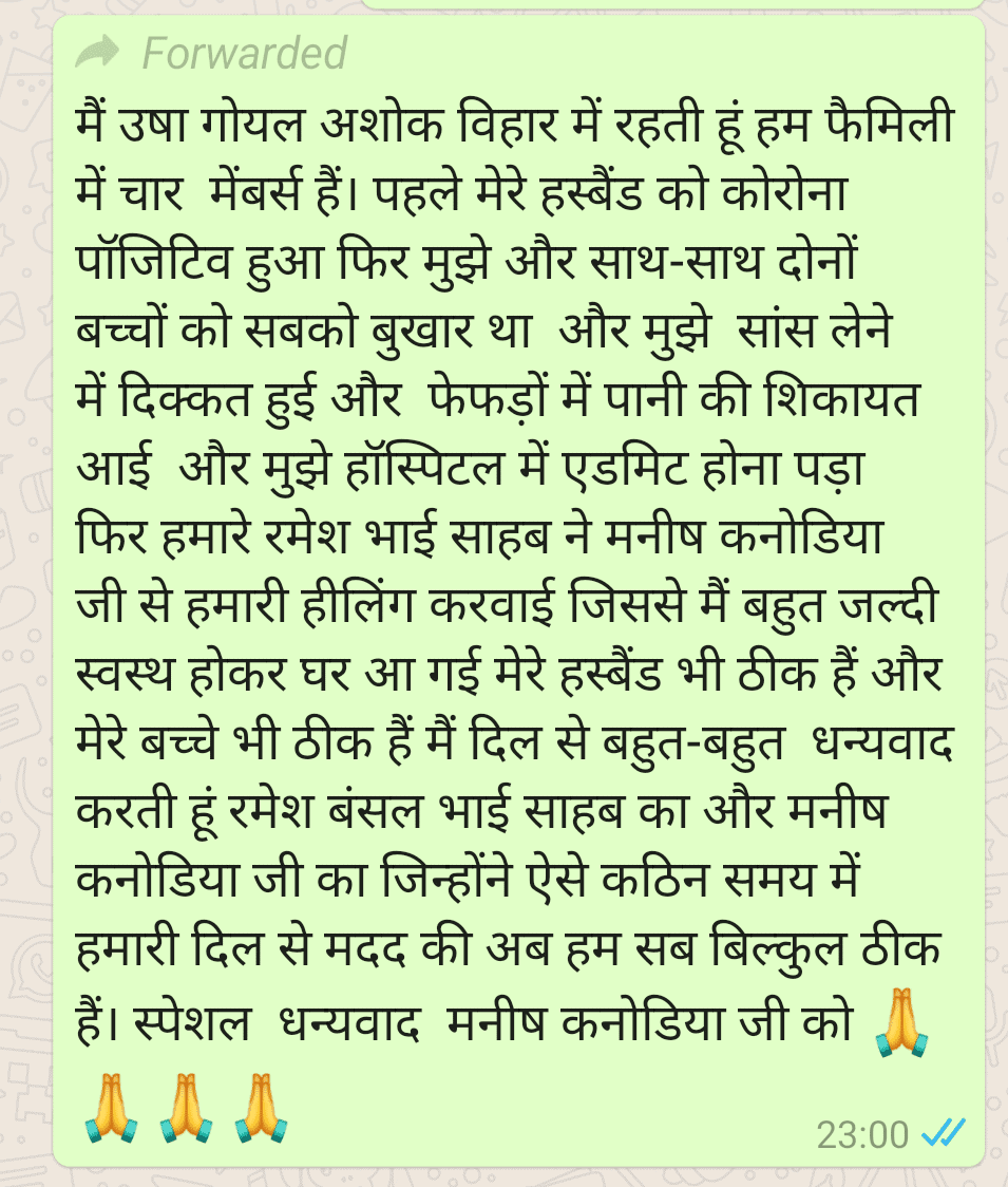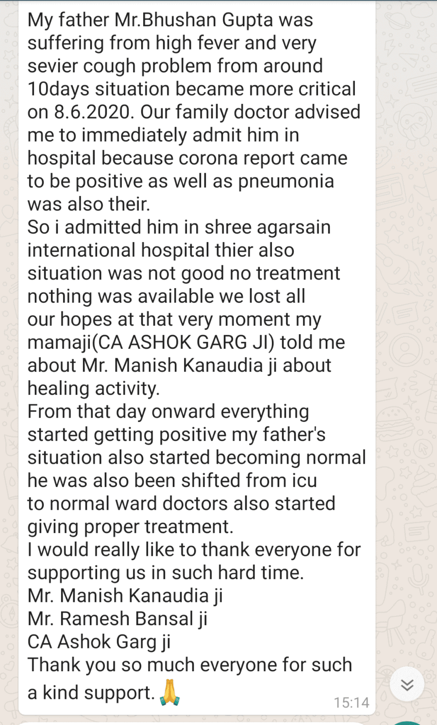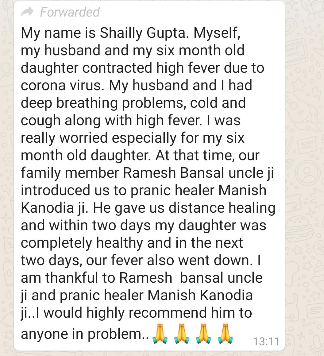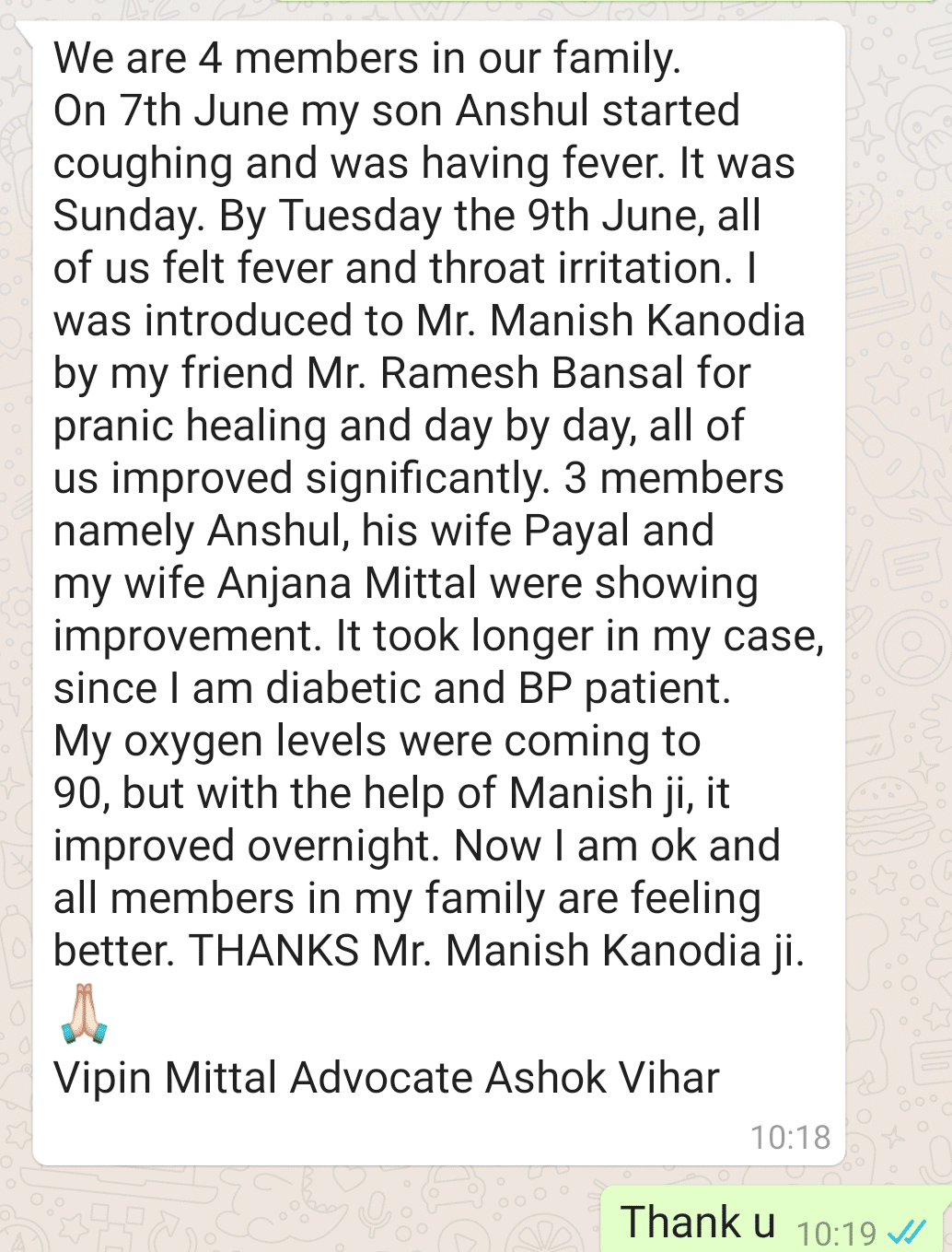 My maternal grandfather and uncle were very ill. When they were tested, it was found that they are covid 19 positive. They had an infection in their chest. They were admited in the hospital, having trouble breathing, due to which oxygen was being used everyday. Thanks to Mr. Manish Kanodia for doing pranic healing.Their chest infection slowly ended with healing and now they are perfectly fine.